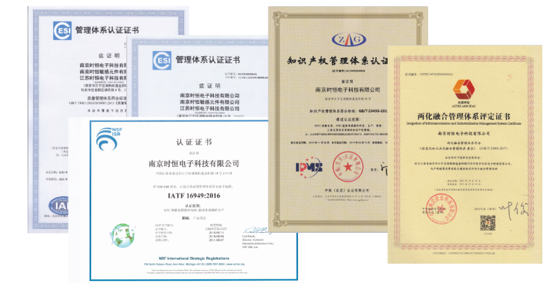 南京时恒电子通过了ISO9001质量管理体系认证、TS16949质量管理体系认证、ISO14001环境管理体系认证、GB/T29490知识产权管理体系认证、GB/T23001两化融合管理体系评定,全部产品均按欧盟RoHS指令实现了环保生产。NTC热敏电阻主要产品均通过CQC标志认证、德国TUV认证